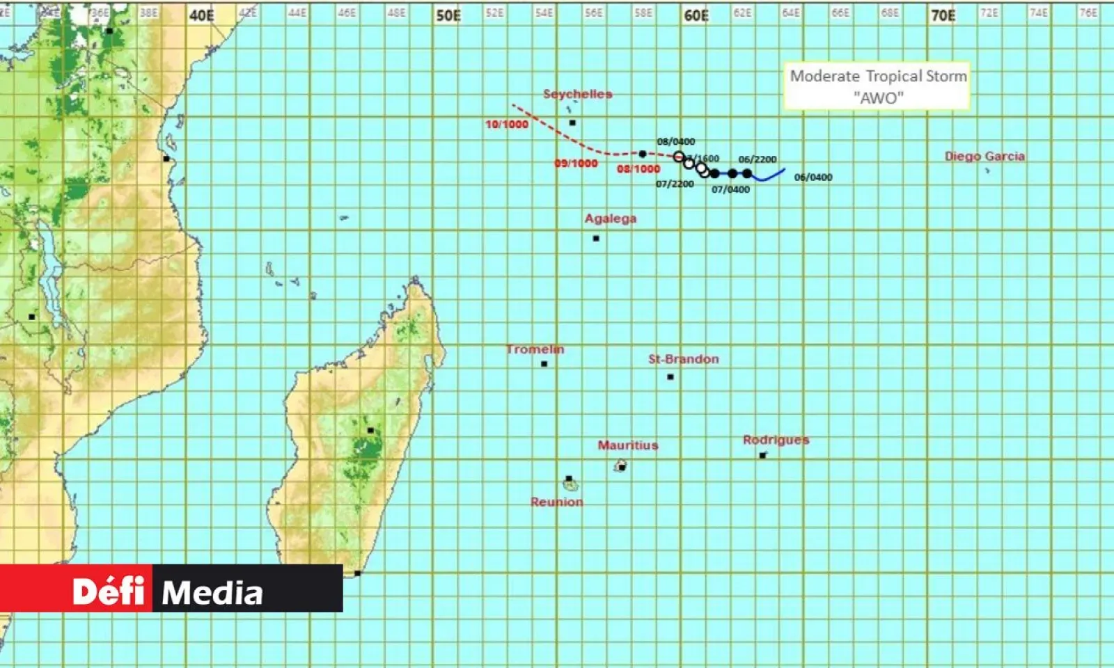 Sur cette trajectoire, la tempête devrait passer à environ 500 km au nord d’Agalega demain matin.