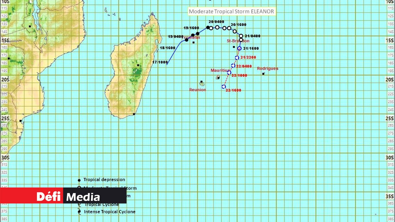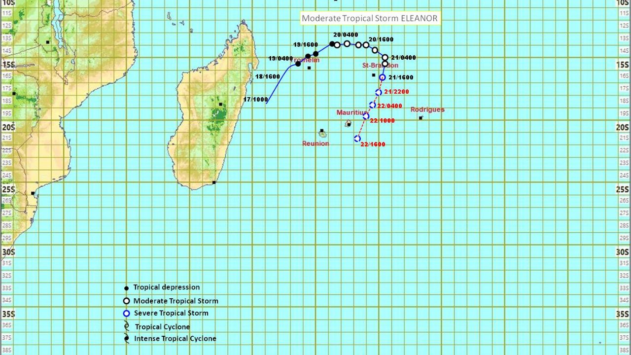 « Les dernières images satellite et autres observations indiquent qu’Eleanor a maintenant atteint l’intensité d’une forte tempête tropicale. À 16 h 00, elle était centrée à environ 470 km presque au nord-nord-est de l’île Maurice, près de 16,6 degrés de latitude sud et 60,3 degrés de longitude est. Au cours des six dernières heures, Eleanor s’est encore rapprochée du sud-sud-ouest et se déplace maintenant à une vitesse accélérée d'environ 20 km/h », indique le service météorologique dans le bulletin cyclonique.