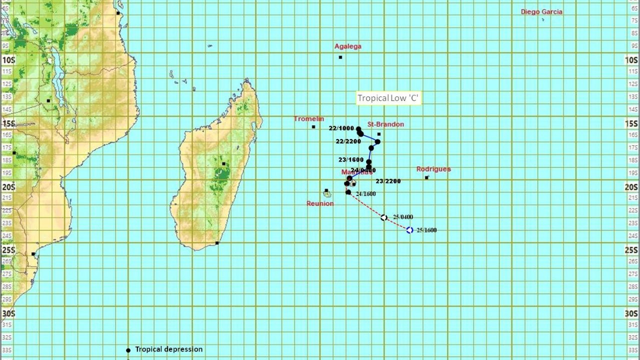 À 4 h, la dépression était située autour du point 19.9 degrés sud en latitude et 57.3 degrés est en longitude. Elle se déplace dans une direction générale de l'ouest-sud-ouest à une vitesse moyenne de 13 km/h. « Certains modèles numériques indiquent encore une faible probabilité que le système se déplace encore vers le sud et le système nuageux associé pourrait s'approcher de l'île Maurice plus tard dans la journée. Cependant, la situation est suivie de près », assure le service météo.