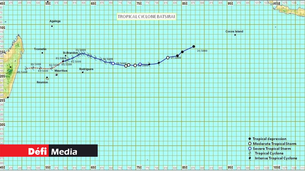 Sur cette trajectoire le cyclone tropical intense Batsirai s'approche de Maurice et représente une menace directe pour l'île.