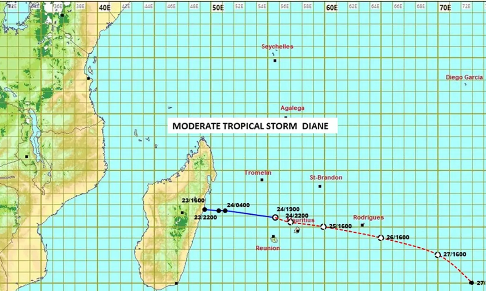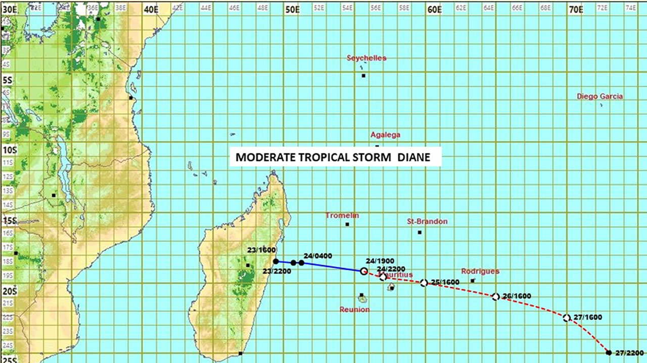 A 22 h, la tempête tropicale modérée Diane était centrée à environ 140 km au nord-ouest de Maurice, soit en latitude 19.3 degrés sud et longitude 56.7 degrés est.