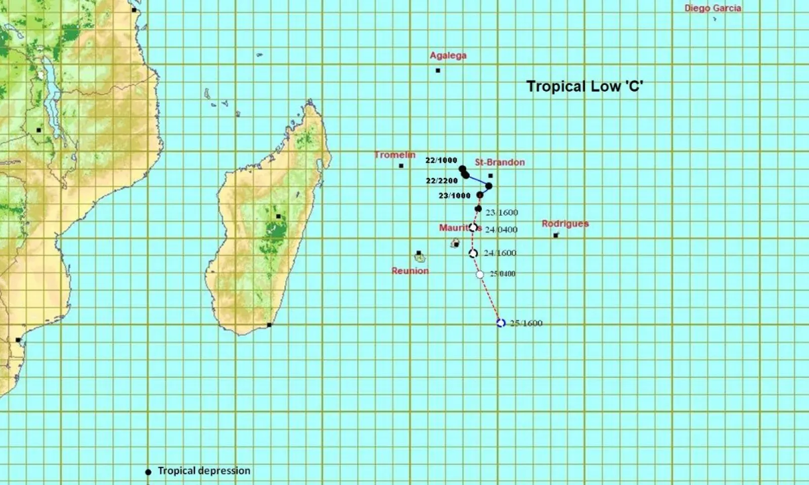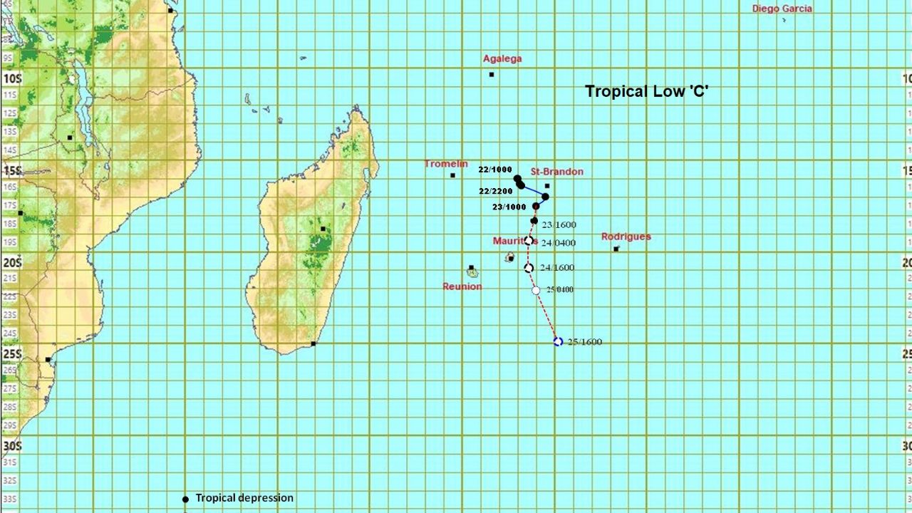 La basse pression située à environ 200 km au nord-nord-est de Maurice autour du point 18.6 degrés sud en latitude et 58.8 degrés est en longitude pourrait s’intensifier en une tempête tropicale modérée.