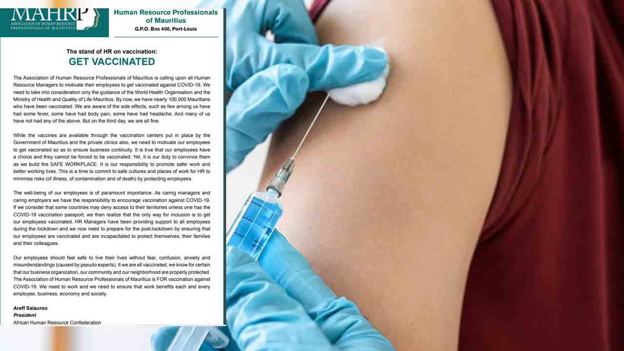 L’Association of Human Resource Professionals of Mauritius, dans un communiqué émis ce soir, jeudi 18 mars, appelle tous les responsables des ressources humaines à motiver les employés pour qu'ils se fassent vacciner contre la Covid-19.