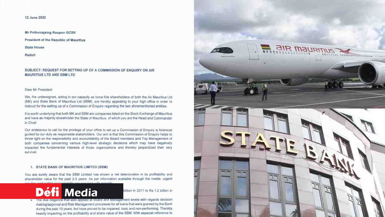 Dans une correspondance au président de la République, Pradeep Roopun, la Listed Companies Minority Shareholders’ Association d'Air Mauritius et de la State Bank of Mauritius (SBM) réclame la mise sur pied d’une commission d’enquête sur la compagnie d'aviation nationale et une autre sur la SBM.
