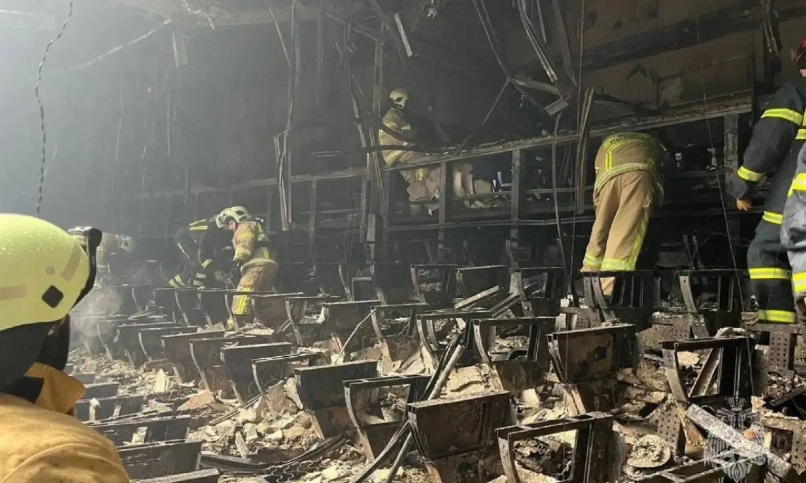 Samedi, la police et les forces spéciales étaient encore déployées devant le Crocus City Hall, le haut du bâtiment étant noirci et partiellement détruit par les flammes de la veille, sous un ciel gris.