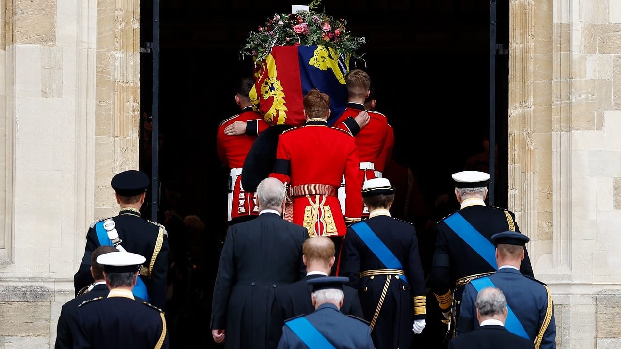 Avant d'être descendu et que ne résonne l'hymne national, le lourd cercueil de chêne et de plomb a été délesté des joyaux qui l'ornaient depuis le décès de la souveraine le 8 septembre - la couronne impériale, le sceptre et l'orbe royaux symbolisant le monde chrétien. Il sera ensuite transféré, avec celui de Philip, l'époux d'Elizabeth II décédé en 2021, dans le mémorial George VI de la chapelle aux côtés des parents de la reine et de sa soeur Margaret.