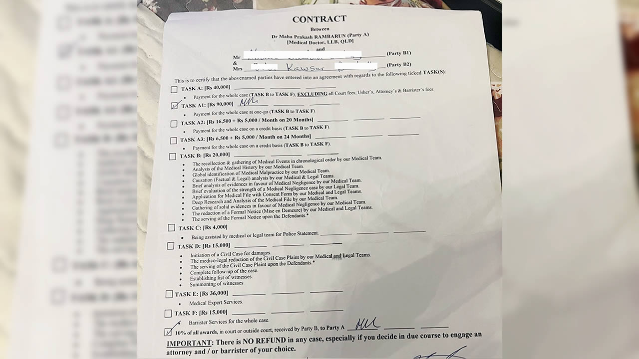Selon Mme Kawsar, le Dr Rambarun lui a réclamé Rs 99 600, incluant des frais d’avocat et des coûts juridiques. Elle aurait accepté sa proposition et aurait effectué le paiement en espèces, le 20 mai 2021, vers 16 heures, au cabinet du médecin.