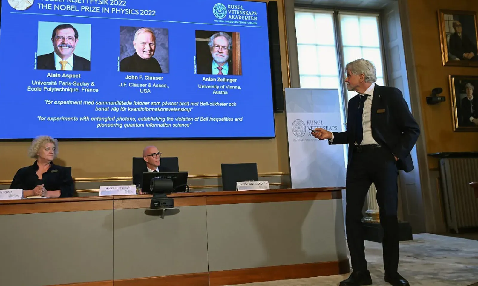 Le trio est récompensé "pour ses expériences avec des photons intriqués, établissant les violations des inégalités de Bell et ouvrant une voie pionnière vers l'informatique quantique", selon le jury Nobel.