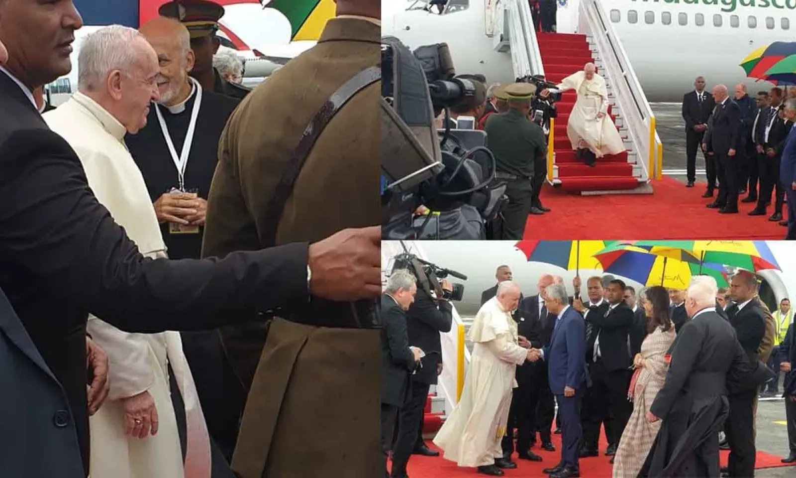 A sa descente d’avion, le Saint-Père, vêtu de blanc avec des chaussures noires, a été accueilli par le Premier ministre, Pravind Jugnauth, le cardinal Maurice Piat et le père Philippe Goupille. C’est dans la simplicité qu’il incarne dans sa mission évangélique que le pape François a enlevé sa calotte blanche en raison du vent présent sur place.