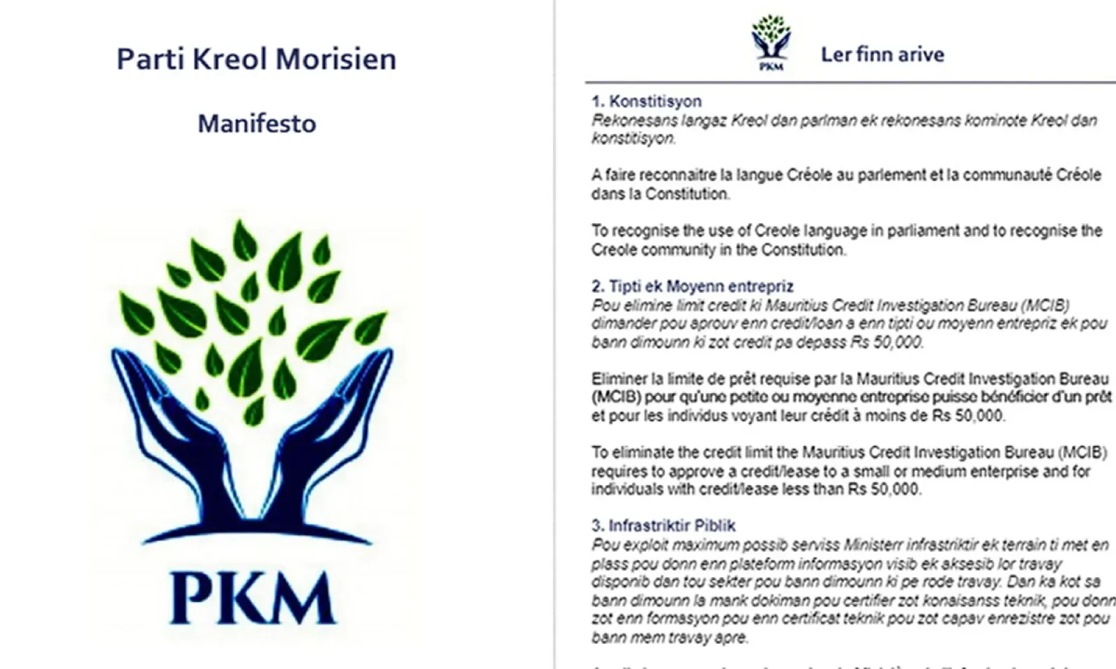 Le Parti Kreol Mauricien (PKM) a dévoilé le contenu de son manifeste électoral en marge des législatives 2019 du jeudi 7 novembre. 19 mesures ont été annoncées, comme notamment «la reconnaissance de la langue créole au Parlement et faire reconnaître la communauté créole au sein de la Constitution.