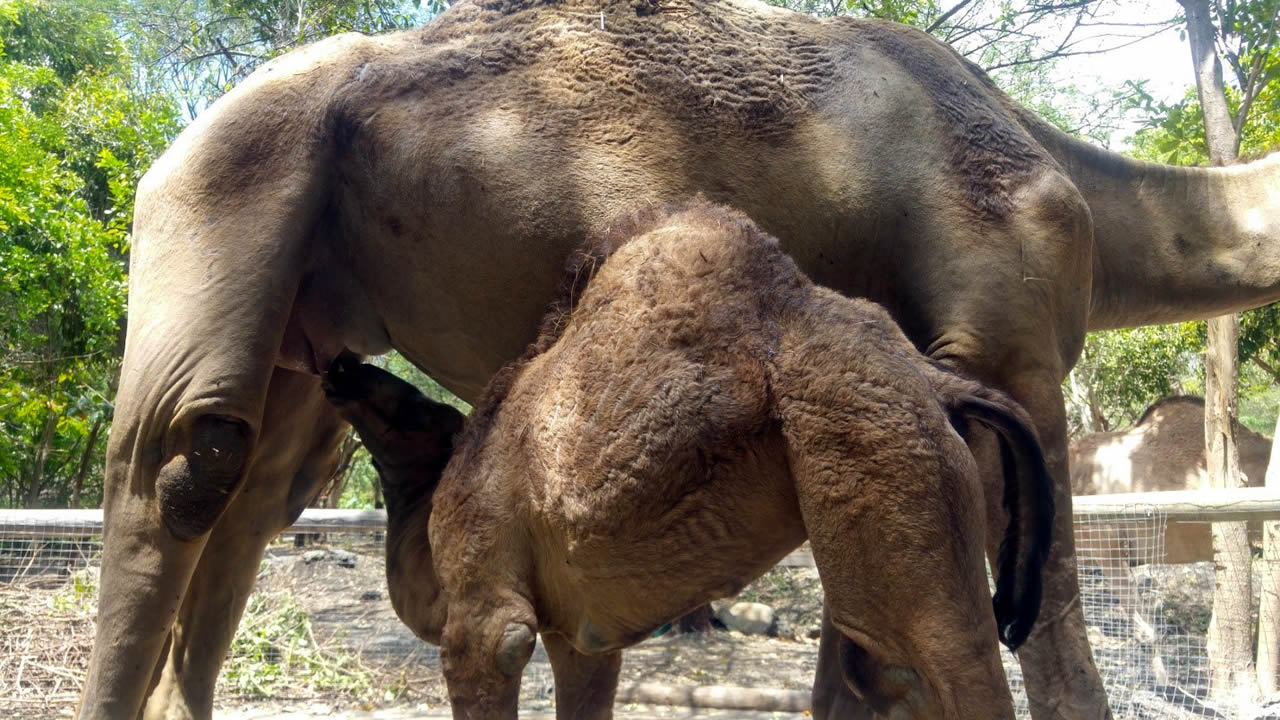 La durée de gestation de sa mère, Joséphine, était de 14 mois. Un après-midi, les autres dromadaires sont allés brouter dans un autre enclos un peu plus loin, alors que la femelle enceinte était gardée tout près, vu qu’elle était pleine. L’accouchement s’est passé sans anicroche, tout à fait normalement. Chancelante et hésitante, encore mouillée, Farah avait hâte de téter sa mère. Deux mois plus tard, Farah tète toujours, mais commence à consommer des carottes, des feuilles et de l’herbe depuis deux semaines.
