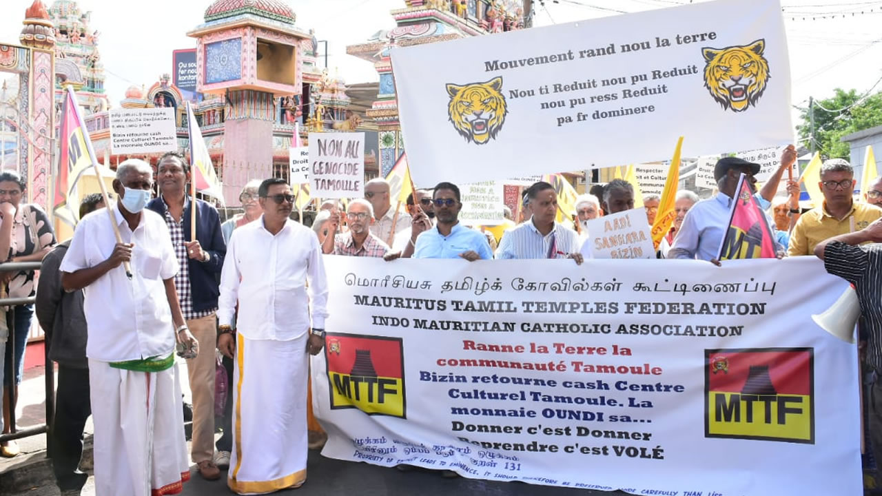Des membres de la Mauritius Tamil Temples Federation, du Mouvement Rand Nou Later et de la société civile ont manifesté dans les rues de la capitale vendredi 30 juin. Ils contestent la décision du gouvernement de reprendre le terrain qui avait été accordé au Mauritius Tamil Cultural Centre Trust à Réduit. Un terrain alternatif à Côte-d'Or/Hermitage a été proposé au Mauritius Tamil Cultural Centre Trust.