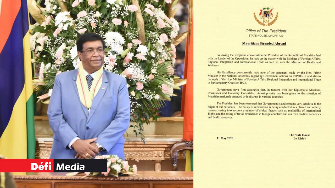 Le président de la République, Prithvirajsing Roopun, s’inquiète du sort des Mauriciens qui sont bloqués dans plusieurs pays. Dans un communiqué émis ce lundi 11 mai, il affirme que suite à une conversation téléphonique qu’il a eue avec le leader de l’opposition, il a soulevé la question de la situation des Mauriciens bloqués à l'étranger avec le ministre des Affaires étrangères aussi bien que celui de la Santé.