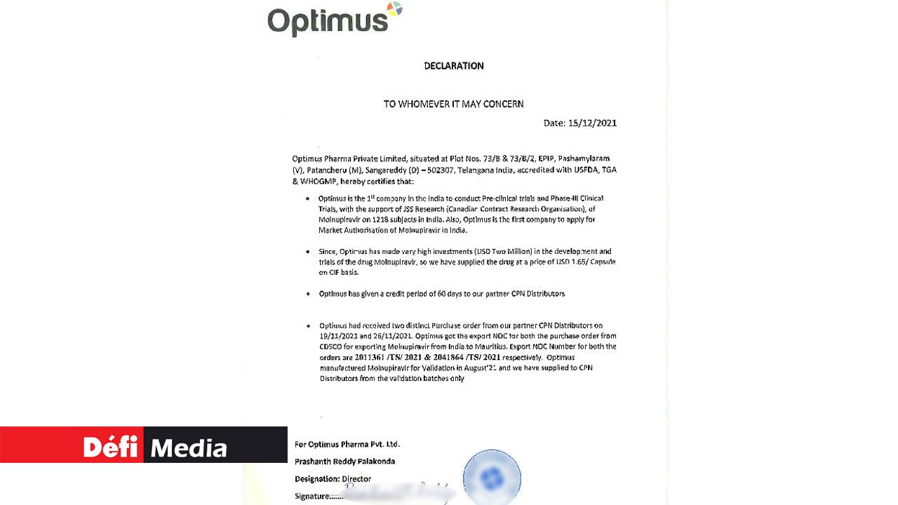 Le 15 décembre, le laboratoire indien a émis un document dans lequel il explique que l’investissement pour la recherche, le développement et la production du Molnupiravir a coûté deux millions de dollars, soit environ 84 millions de roupies mauriciennes. « Le médicament a donc été vendu à 1,62 dollar l’unité », est-il indiqué. Le contenu de ce document fait l’objet d’une vérification de l’Independent Commission Against Corruption (Icac) à la lumière d’autres éléments en sa possession. Le directeur de CPN Distributors Ltd, Jay Kumar (Akash) Chuttoo, sera aussi appelé à venir s’expliquer une nouvelle fois au Réduit Triangle cette semaine.