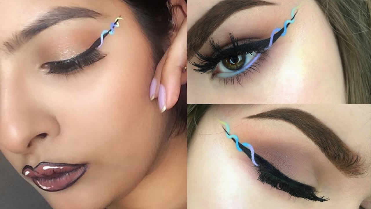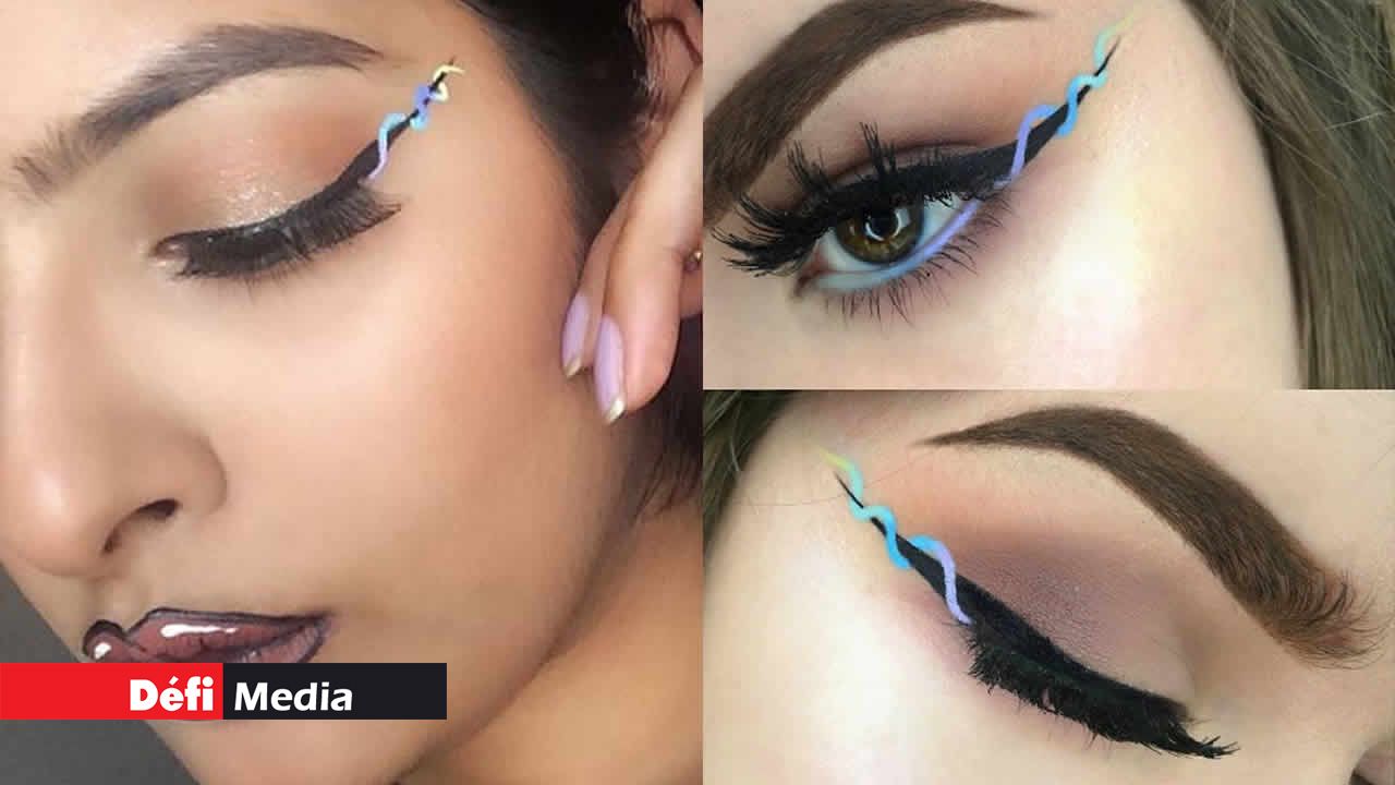 Les Anglo-saxons ne se sont pas encore mis d'accord sur le nom de cette nouvelle tendance. Ainsi, sur les réseaux, on verra plusieurs appellations : eye-liner « ribbon » (ruban), « helix » (hélice) ou encore « twisted » (entortillé). Une multitude de termes mais une idée unique : créer un cat-eye avec un eye-liner noir classique et y ajouter des spirales colorées. Le trait de couleur doit s’enrouler autour de la pointe noire préalablement tracée. Une fois que l'on a compris le principe, on peut s’amuser. Par exemple, faire un trait avec un seul eye-liner coloré ou bien mélanger les couleurs pour créer un dégradé. Encore faut-il déjà maîtriser l'art du trait de liner et éviter les erreurs qu'on fait toutes avec notre eye-liner. Cette mode s’adresse donc aux fanas de beauté les plus aguerries.