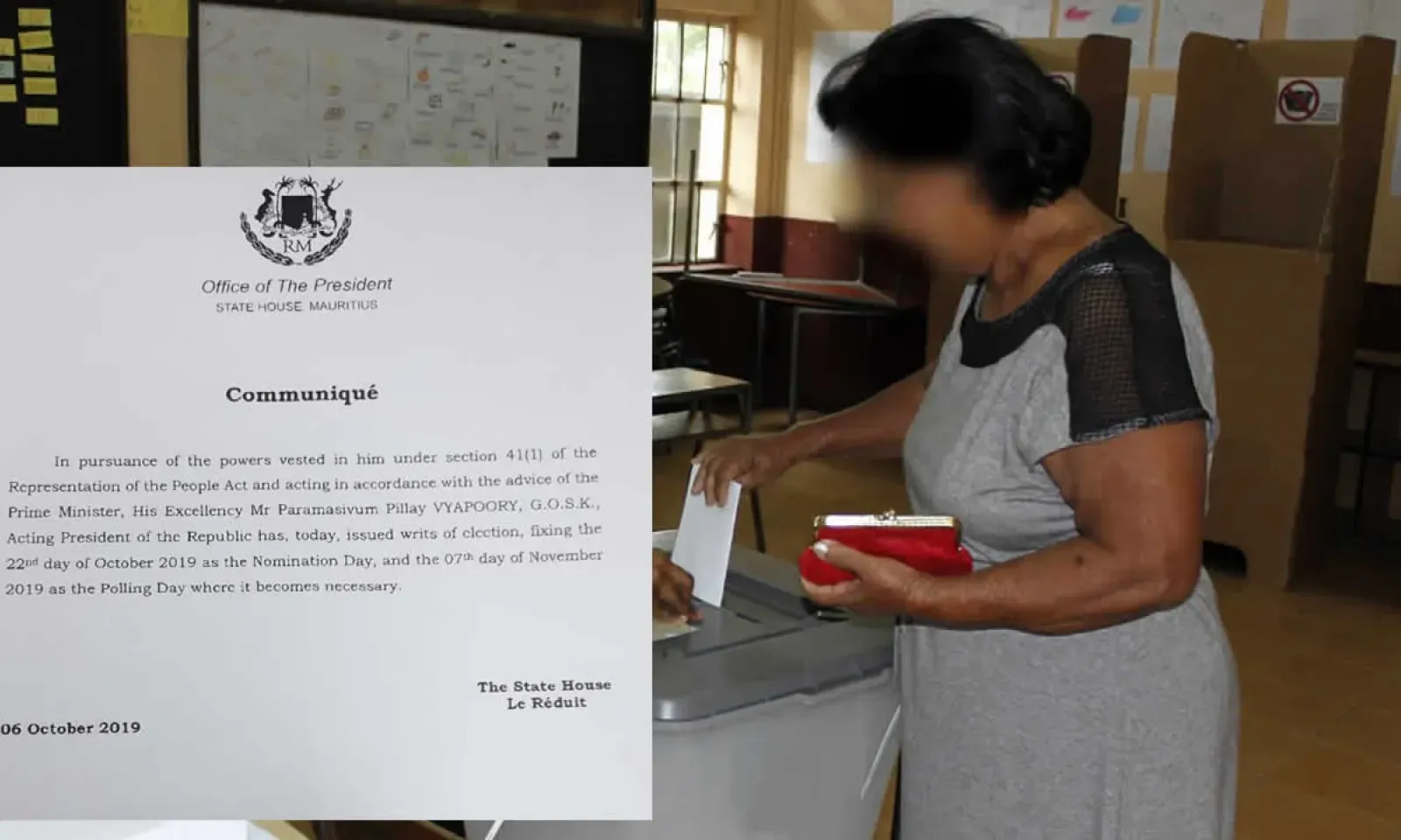 La State House a émis ce dimanche soir 6 octobre les «Writs of Election» après la dissolution du Parlement. Le Président de la République par intérim, agissant sur l'avis du Premier ministre, Pravind Jugnauth, et en vertu de l'article 41 (1) de la Representation of the People Act, a émis les «Writs of election» pour fixer les élections générales au jeudi 7 novembre. L'exercice de dépôt des candidatures aura lieu le mardi 22 octobre.
