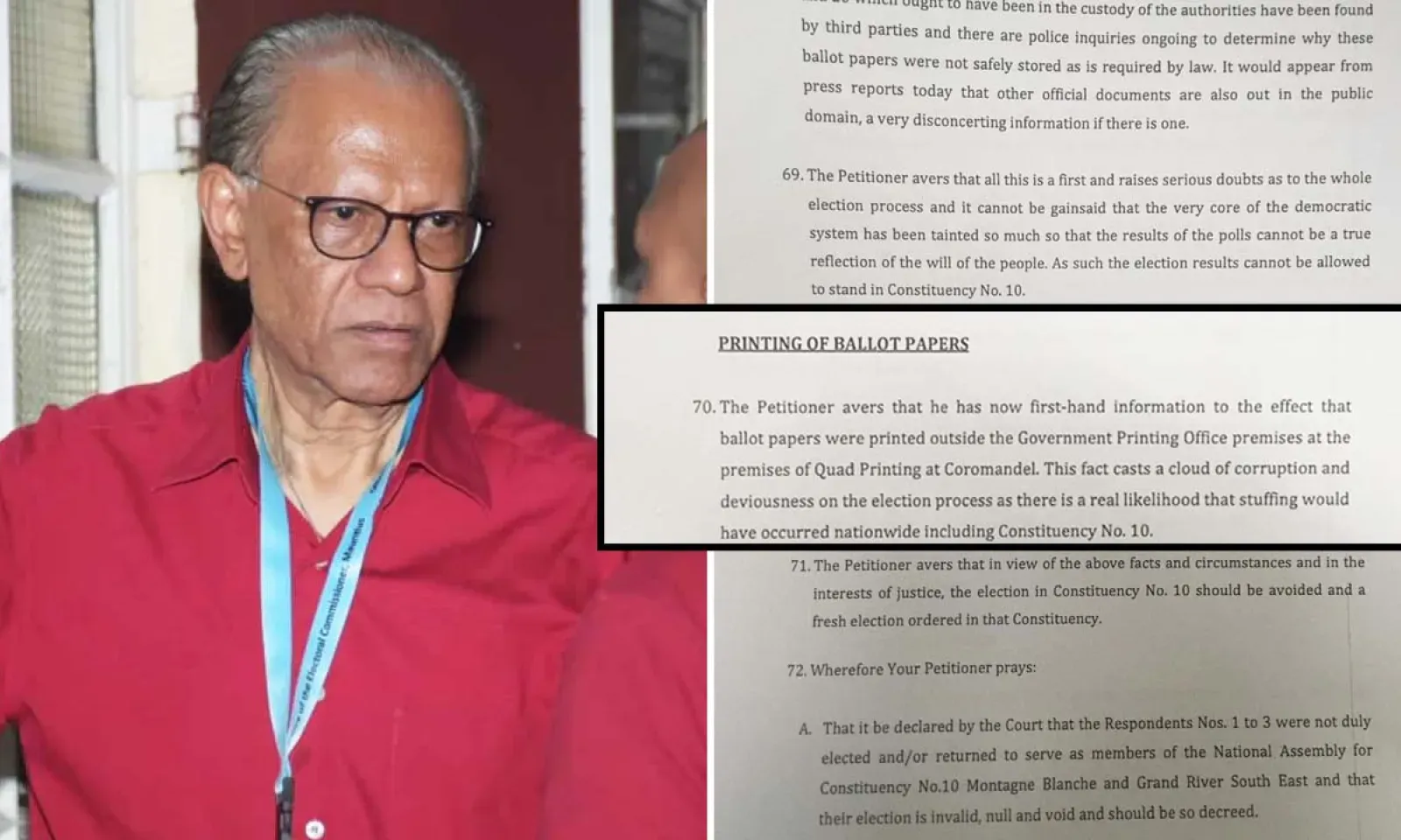 «The Petitioner [Navin Ramgoolam, Ndlr] avers that he has now first-hand information to the effect that ballot papers were printed outside the Government Printing Office premises at the premises of Quad Printing at Coromandel. This fact casts a cloud of corruption and deviousness on the election process as there is a real likelihood that stuffing would have incurred nationwide including Constituency No. 10», dit le leader du PTr dans sa pétition électorale. La Cour suprême examinera sa demande le 9 décembre.