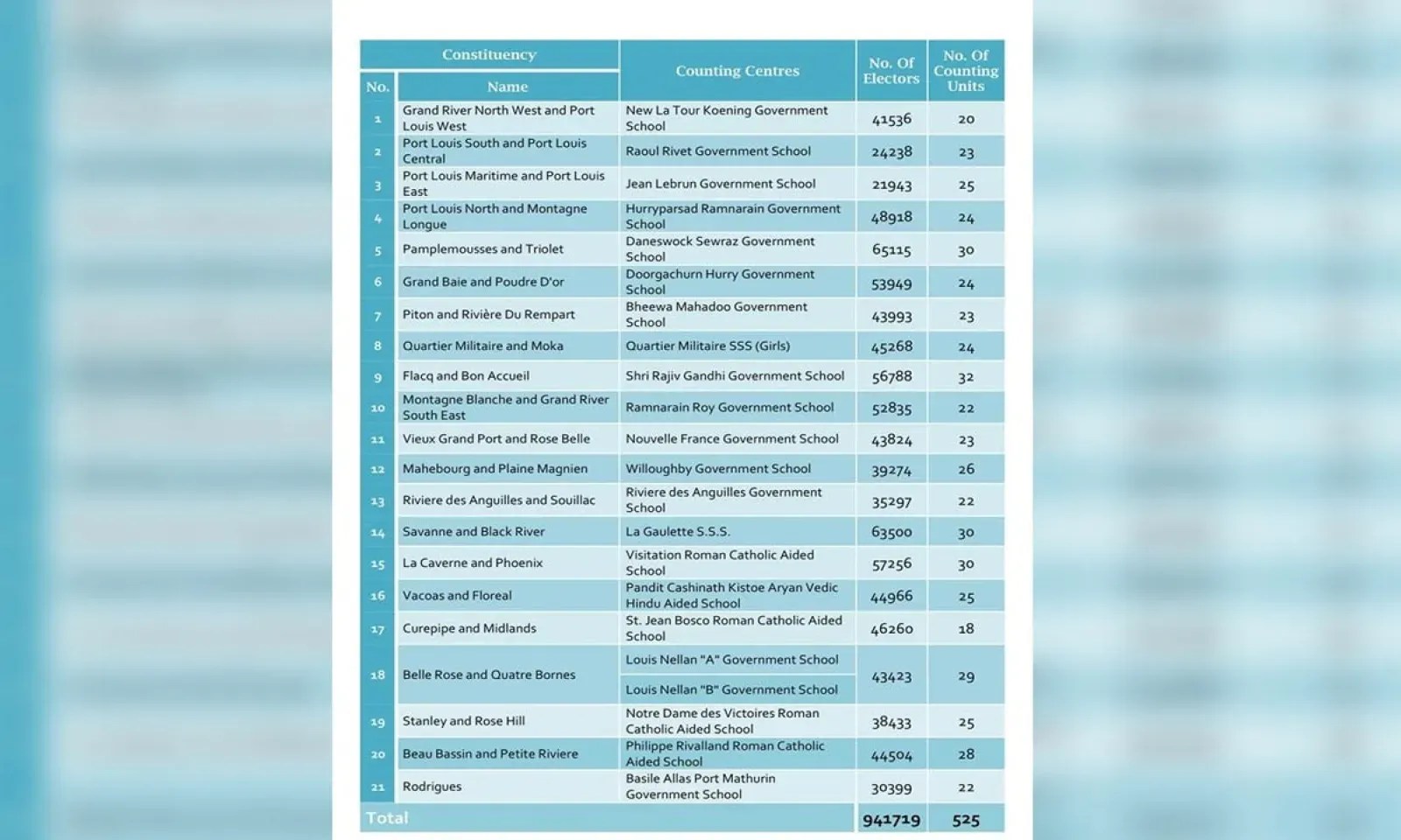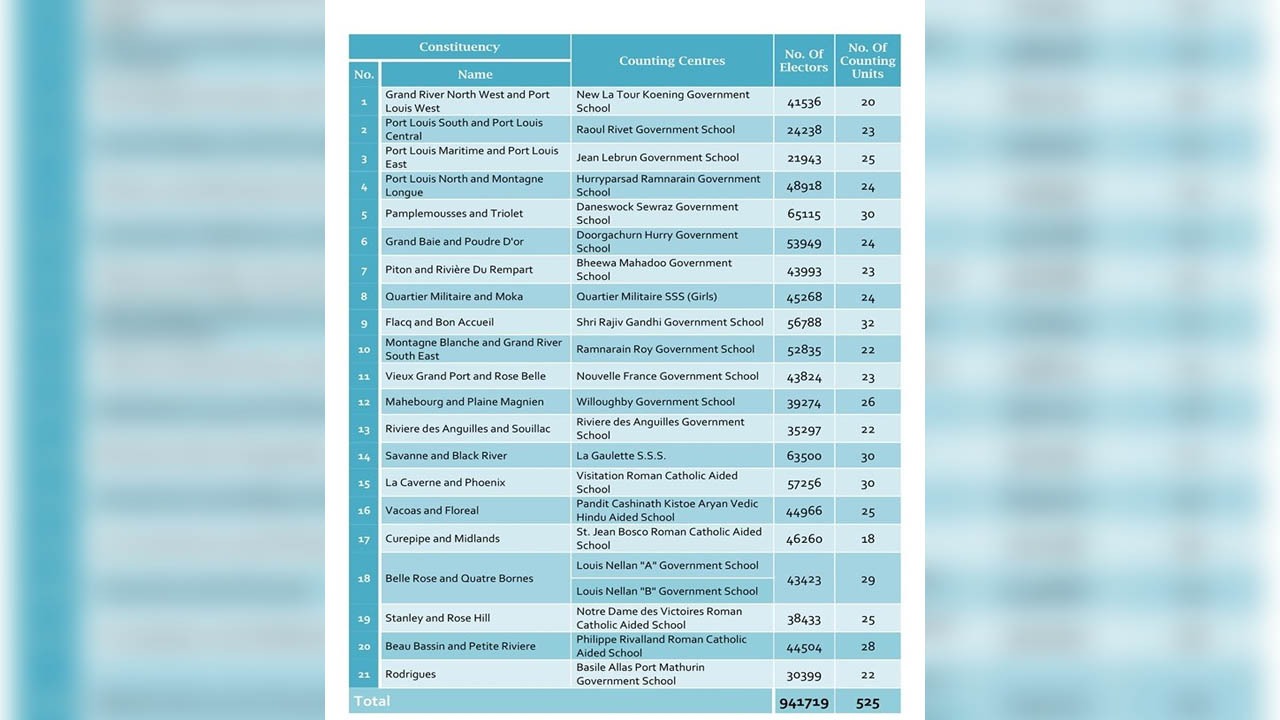 D’autre part, la circonscription où il y a le plus grand nombre d’électeurs est la circonscription 5 (Pamplemousses/Triolet) avec 65 115 électeurs soit 1 615 de plus que la circonscription No 14 (Savanne/Rivière-Noire).
