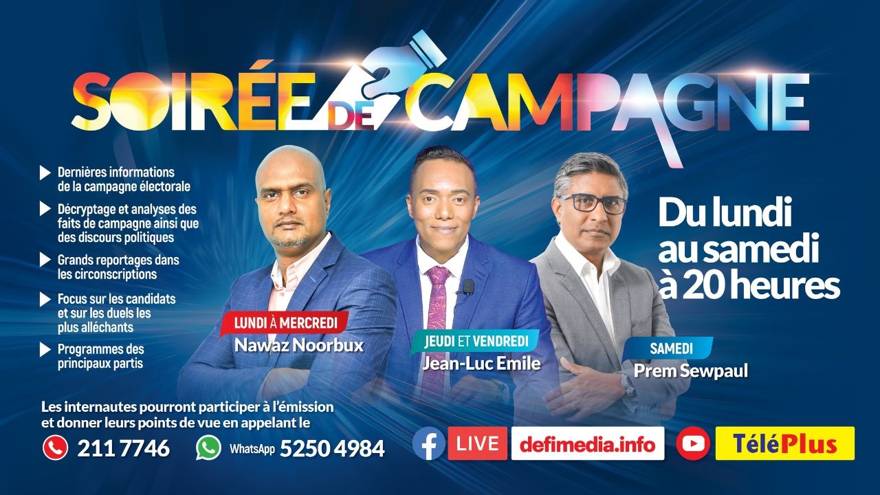 Ne manquez pas «Soirée de Campagne». Du lundi au mercredi, vous serez en compagnie de Nawaz Noorbux, tandis que les jeudis et vendredis, Jean-Luc Emile vous accompagnera. Prem Sewpaul vous donnera rendez-vous les samedis. Retenez l'heure : 20 h, sur la page Facebook defimedia.info et TéléPlus sur YouTube.