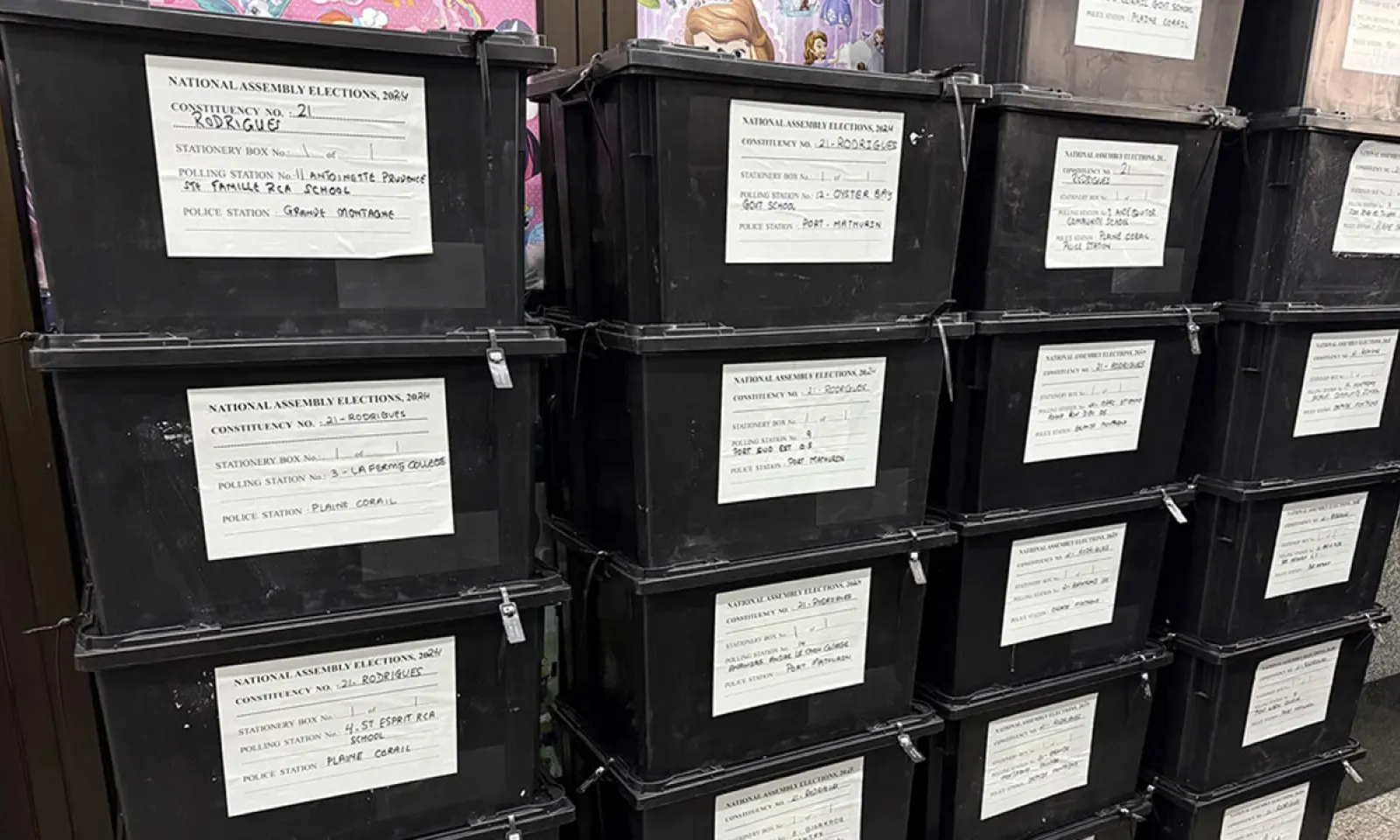 Les boîtes contenant les documents, formulaires et bulletins des différents bureaux de vote sont transportées dans des camions sous une forte escorte policière. À Maurice, les boîtes sont sécurisées dans cinq « Guard Rooms » scellées, aménagées dans des postes de police et un centre de détention.