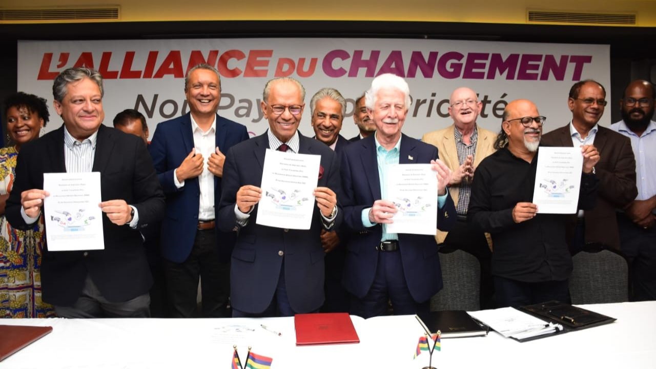 « Historique ». C’est ainsi que le leader du PTr, Navin Ramgoolam, qualifie l’accord électoral signé ce jeudi entre les rouges, le MMM, Nouveaux Démocrates et Rezistans ek Alternativ. Ces quatre partis participeront aux législatives du 10 novembre sous la bannière de l’Alliance du Changement. L’accord électoral porte sur les douze points suivants :
