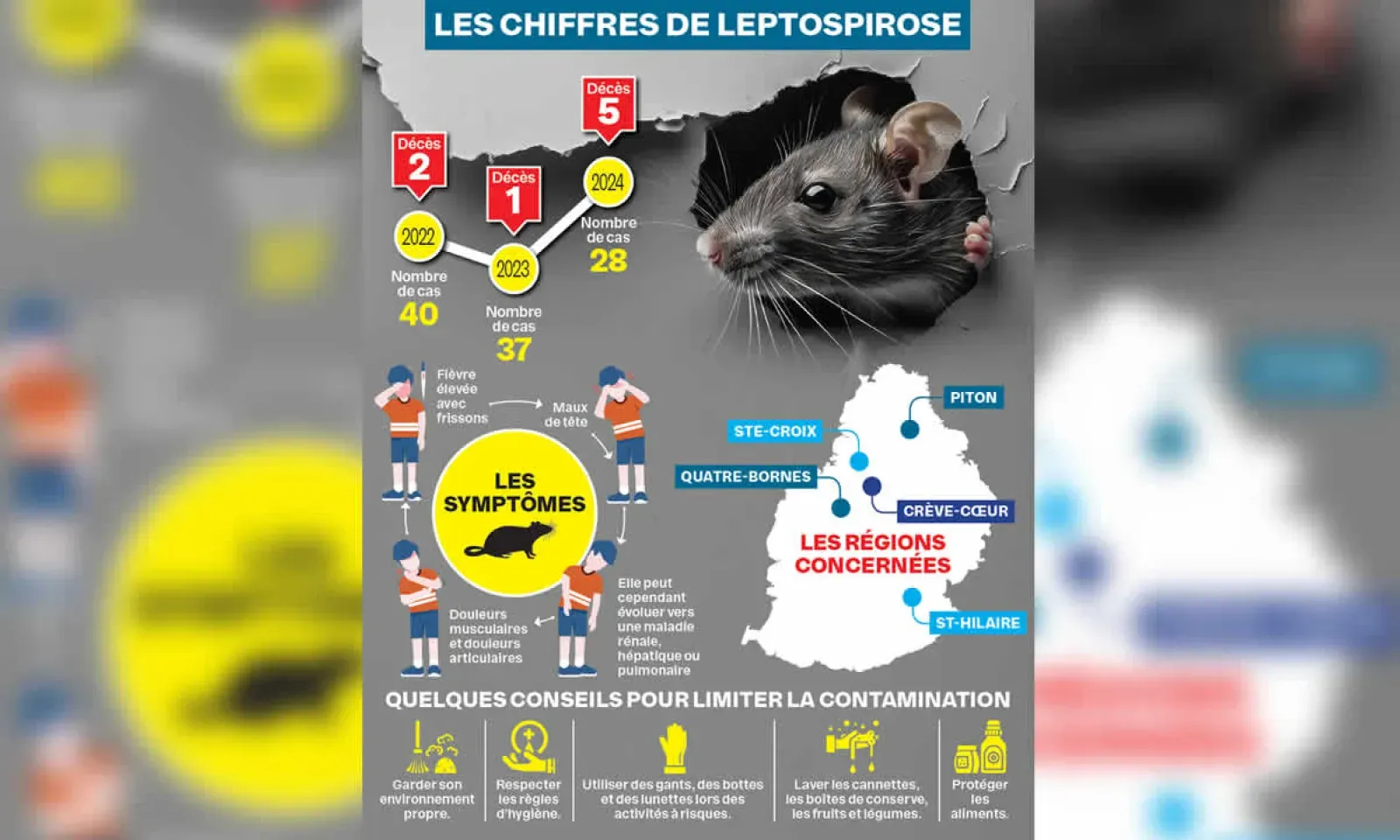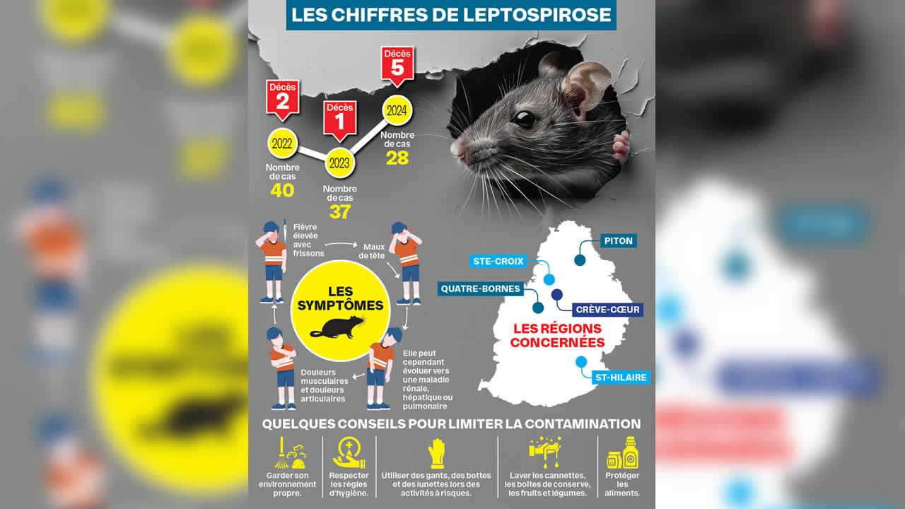 On dénombre actuellement cinq cas actifs de leptospirose à Maurice. Cette information a été communiquée par le ministère de la Santé le mercredi 15 mai. Les régions où ces cas ont été détectés sont : Piton, Crève-Cœur, Ste-Croix, St-Hilaire et Quatre-Bornes. Tous les patients sont hospitalisés.
