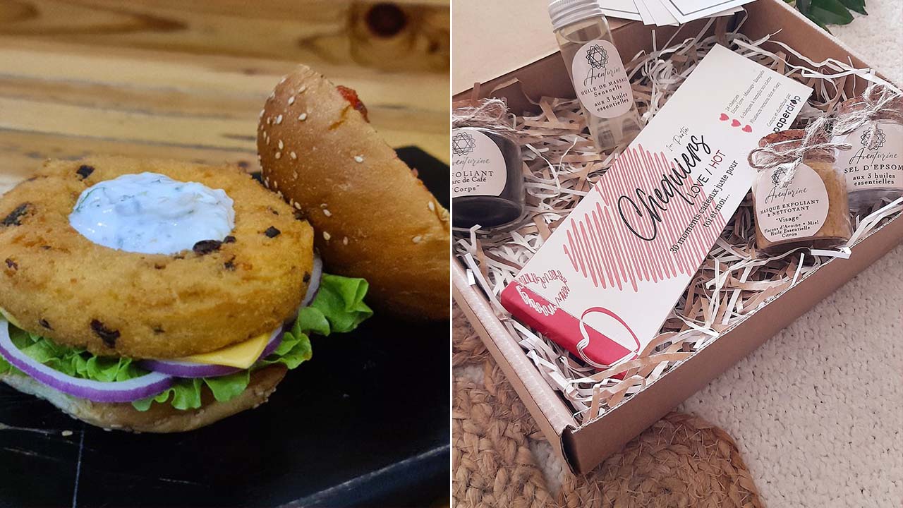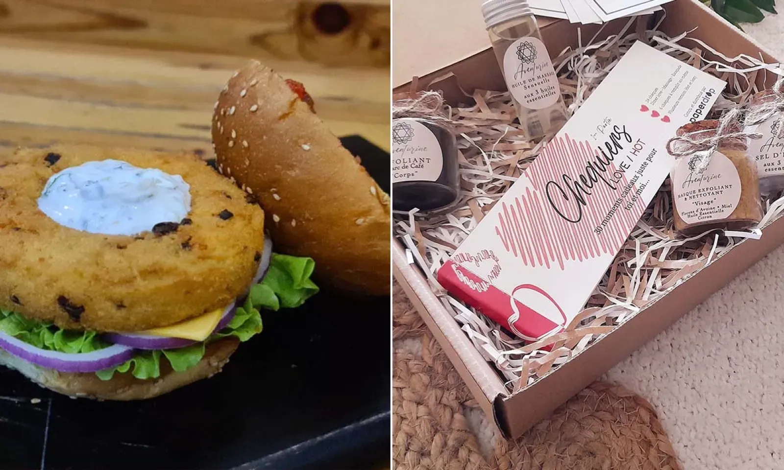 Les couples y trouveront aussi quatre petits pots de produits naturels faits maison, concoctés par Sandrine Malépa : du sel d’Epsom aux trois huiles essentielles, un exfoliant marc de café à l’huile essentielle pour le corps, une huile de massage « sensuelle », et un masque exfoliant et nettoyant pour le visage à base de flocon d’avoine et de miel. Par exemple, si dans le chéquier, il y a un bon « bain de pied avec massage », le couple peut utiliser le sel d’Epsom et l’huile de massage.