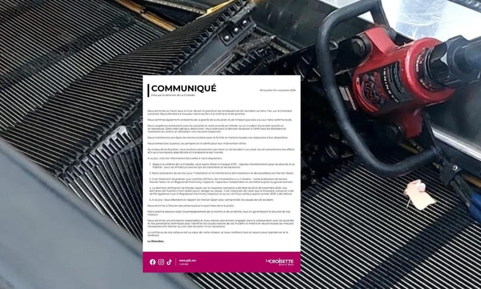 «La dernière vérification sur le traveletor concerné a été faite les 19 et 20 novembre 2024. Ces dernières vérifications n’ont révélé aucun danger ou risque […] A ce jour, nous attendons le rapport de Manser Saxon pour comprendre les causes de cet accident», affirme la direction Grand Baie La Croisette dans un communiqué émis ce dimanche, au lendemain de l’accident survenu dans ce centre commercial où Fatima, 21 ans, a eu les pieds broyés dans un traveletor. Elle a dû être amputée de la jambe droite. Elle est toujours admise à l’unité des soins intensifs de l’hôpital du Nord. Les médecins font tout leur possible pour sauver la jambe gauche.