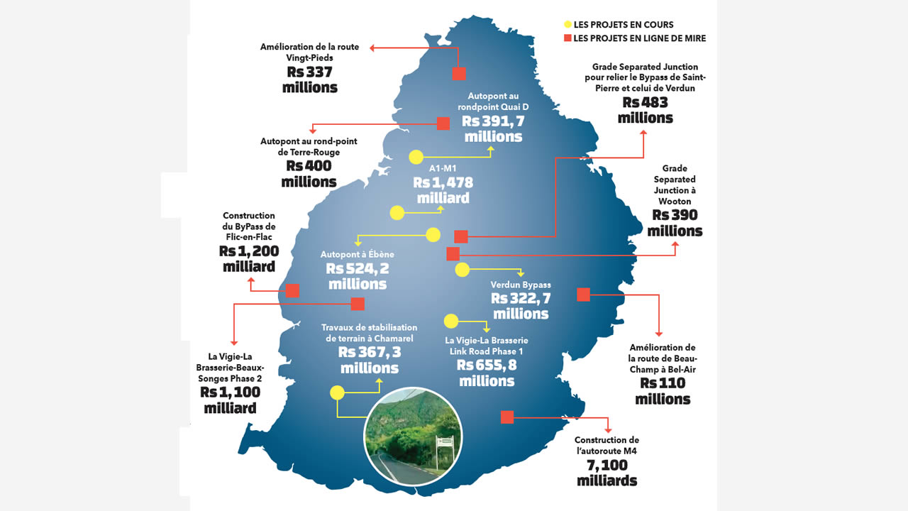 Plusieurs projets sont en chantier dans les quatre coins du pays. Certains viennent de démarrer et d’autres vont bientôt débuter. Si le développement routier domine le secteur de la construction, toutefois il y a d’autres projets du gouvernement. L’État dépensera une somme de Rs 20 milliards pour les routes. Cela inclut les Rs 3,4 milliards sur des projets qui ont déjà été complétés.