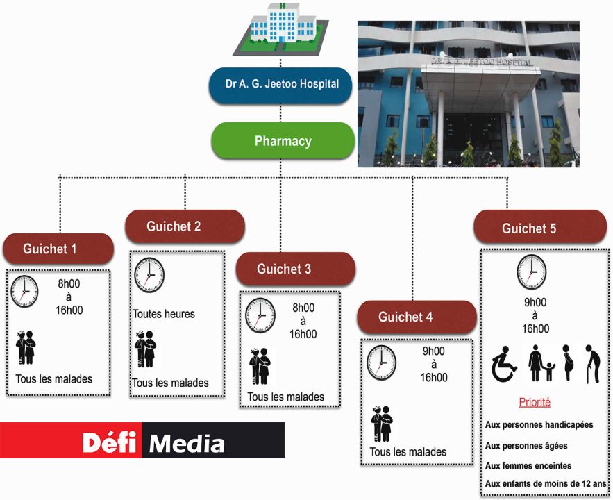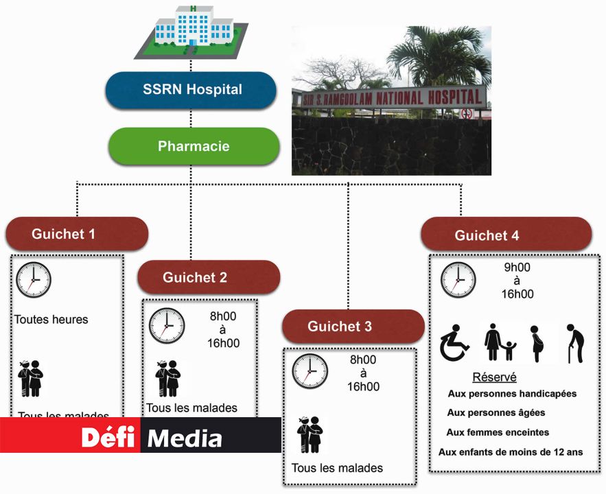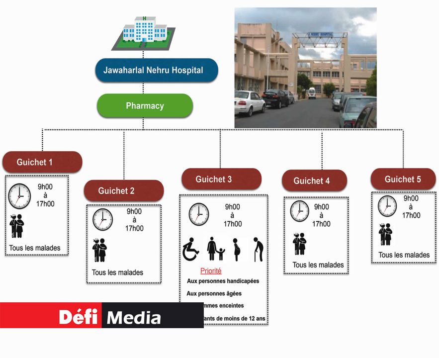 Il est 17 heures ou presque lorsque nous arrivons à l’hôpital J.-Nehru, à Rose-Belle. Ici, les trois guichets ferment justement à 17 heures. Pendant la soirée, les patients peuvent se rendre à un autre guichet situé dans un bâtiment annexe. Celui-ci, qui ressemble un peu à ceux de l’hôpital de Flacq, sert tous les médicaments et il est opérationnel en permanence.