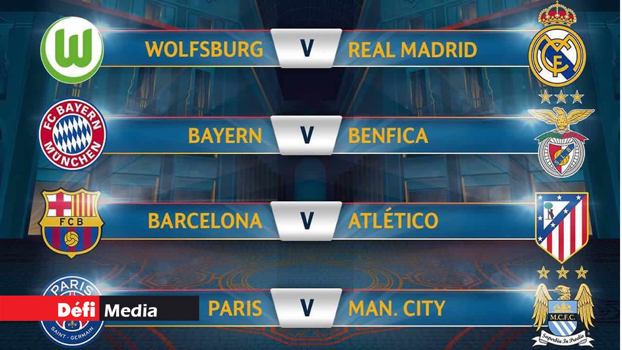 • Paris SG v Manchester City • Barcelone v Atletico Madrid • Bayern Munich v Benfica • Wolfsburg v Real Madrid