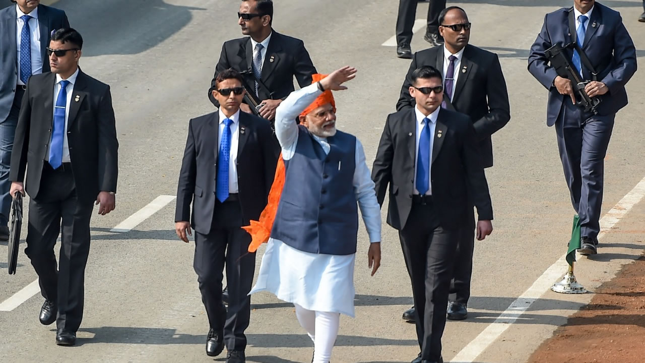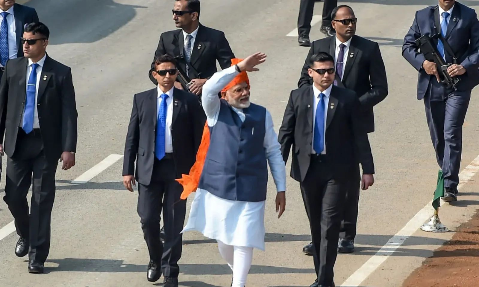 Portant une casquette bordeaux du Corps national des cadets, la branche jeunesse des forces armées indiennes, le dirigeant nationaliste hindou a notamment mis en avant les frappes de l'armée de l'air indienne en territoire pakistanais en 2016 et 2019.