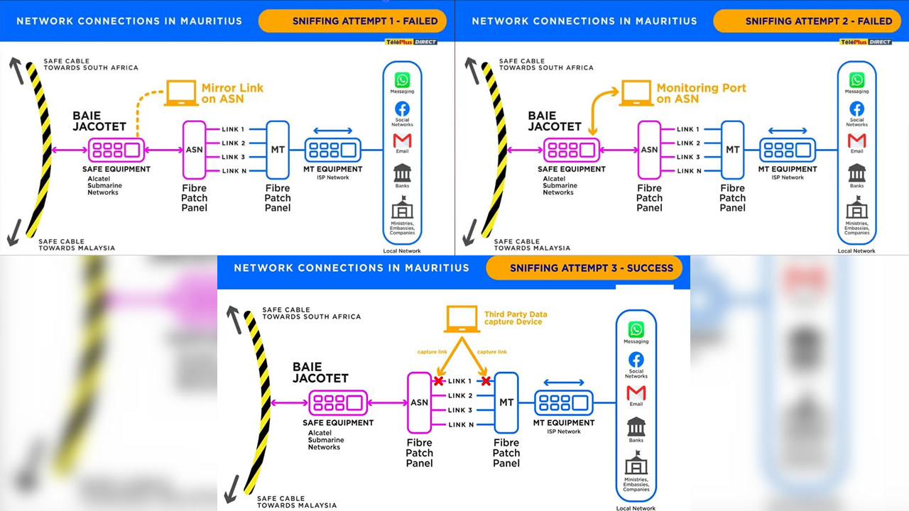 Selon cette présentation, le matériel (en jaune) utilisé par le technicien indien aurait d’abord été connecté à l’équipement du câble SAFE et non à celui de Mauritius Telecom contrairement à ce qu’ont avancé les ministres Maneesh Gobin et Deepak Balgobin le samedi 16 juillet 2022 lors d’une conférence de presse. Les deux premières tentatives de sniffing sur l’équipement du câble, à savoir un ‘mirror link’ et un ‘monitoring port’, auraient échoué. Cependant, une troisième tentative sous la forme d’une connexion au niveau des links entre les deux panneaux aurait été une réussite. C’est ainsi qu’aurait eu lieu l’interception des données pendant deux minutes.
