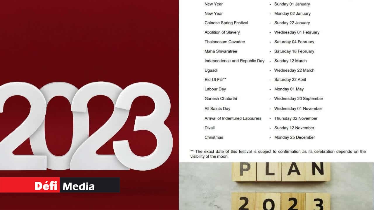 Sept jours fériés de 2023 tombent pendant le week-end. C’est ce qu’indique la liste des congés publics pour 2023 qui a été avalisée par le Conseil des ministres qui s’est réuni ce vendredi 15 juillet. Les fêtes concernées sont celles du Nouvel An (1er janvier) qui tombe un dimanche, la fête du Printemps (22 janvier) qui est aussi un dimanche tandis que le Thaipoosam Cavadee (4 février) et la Maha Shivratree ( 18 février) sont samedis. Ensuite, la Fête de l’Indépendance (12 mars) est un dimanche et la fête de l’Eid-Ul- Fitr (22 avril) sera un samedi dépendant de la visibilité de la lune. Et la Divali (12 novembre) sera célébrée un dimanche.
