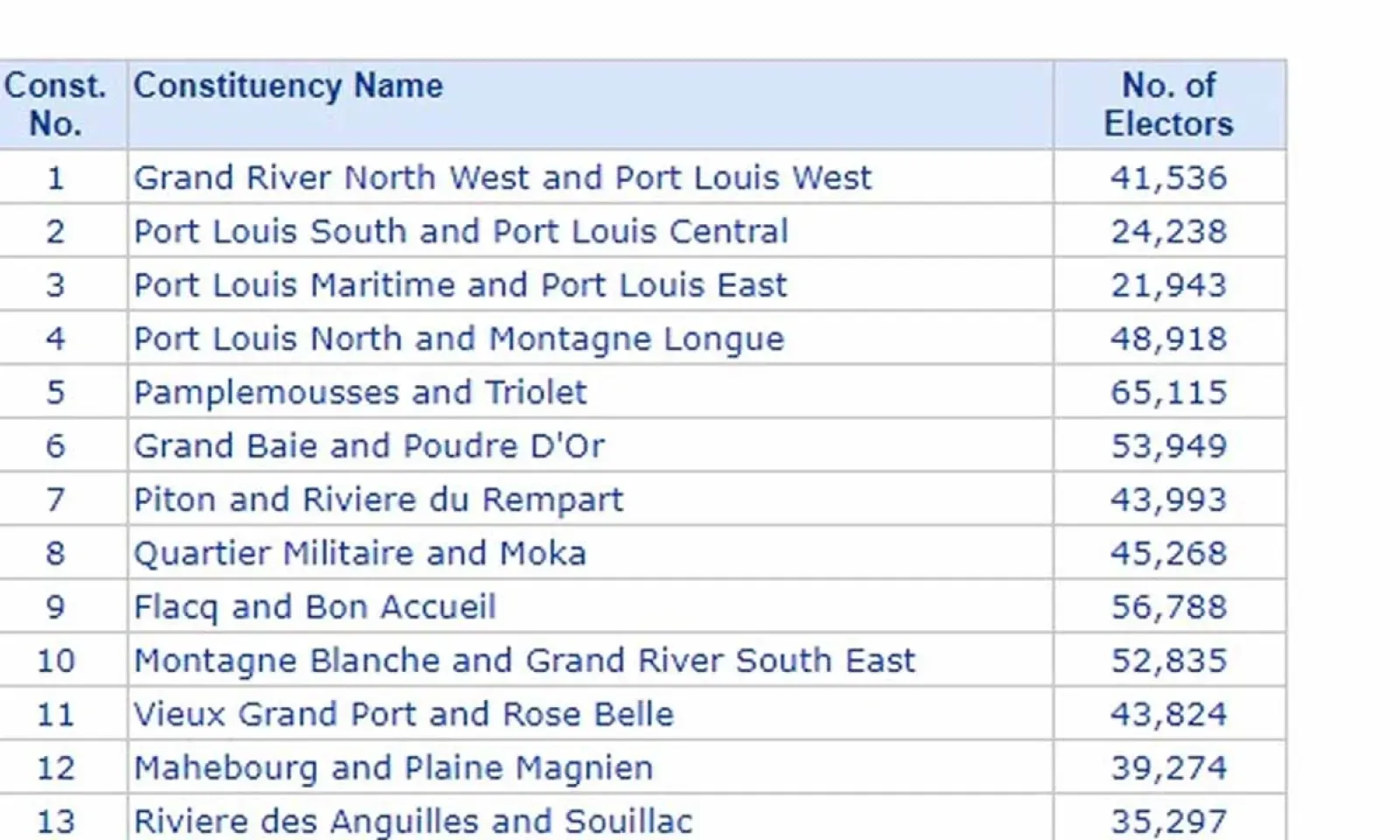 C’est la circonscription no 5 (Pamplemousses /Triolet) qui dénombre le plus d’électeurs dans le pays, soit avec 65 115 inscrits. De son côté, la circonscription no 14 (Savanne/Rivière-Noire) recense 63 500 électeurs.