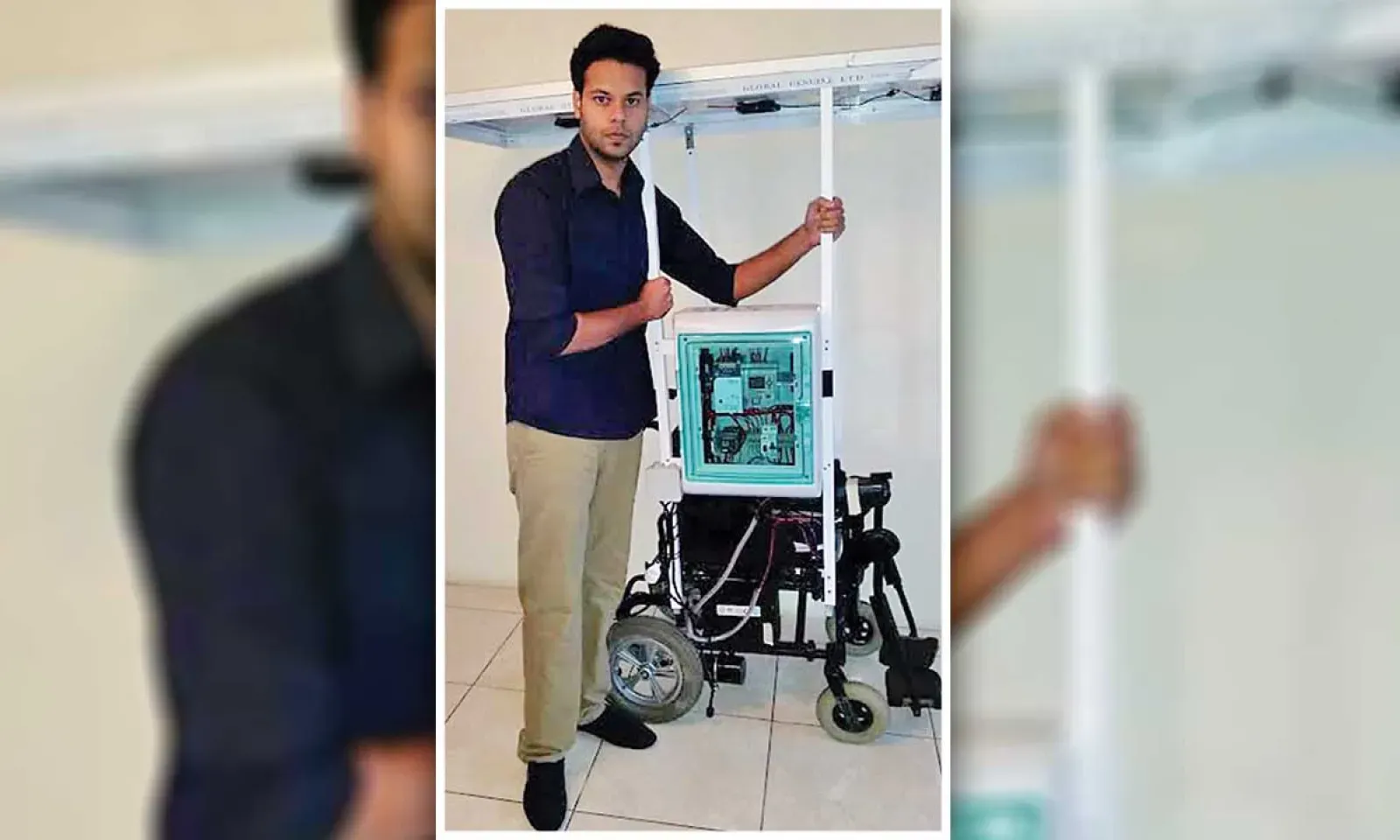 “The prototype is designed such that it can be charged outdoors with three solar panels of 50 Watts fixed on the top of the wheelchair. 30 minutes of charging from solar energy can provide around three to four hours of autonomy. To provide a user with full mobility, I made use of a Programmable Logic Controller (PLC) which is like a “super mini- computer” in which I uploaded a series of complex coding. This allows the wheelchair to move autonomously through pre-defined paths. The wheelchair is also equipped with special sensors that detect the presence of obstacles, such as a person walking in front of it. Then, it switches off temporarily the engine of the wheelchair until there are no more obstacles. This concept is new in Mauritius where at the click of a button, a user can move through a pre-defined path, like from the kitchen to the bedroom,” he shares.