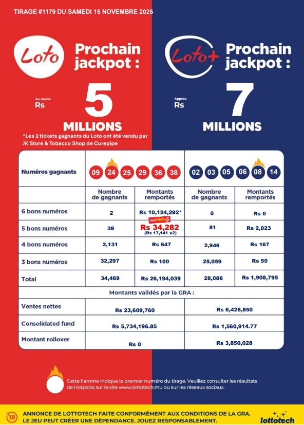 Le jackpot du Loto de ce samedi 15 novembre a fait deux gagnants, qui remportent Rs 10 124 292 chacun. Les deux tickets du Loto ont été vendus par JK Store & Tobacco Shop à Curepipe. C’est ce qui ressort du communiqué émis par Lottotech ce soir.