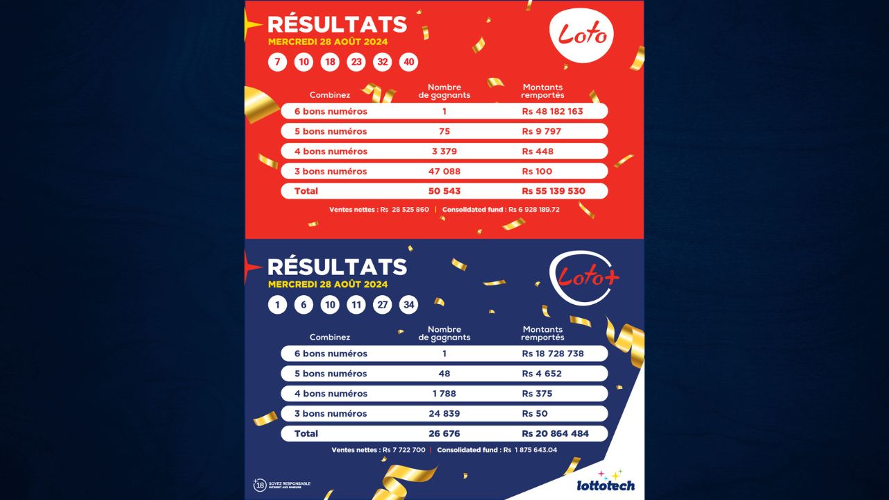 Deux joueurs ont trouvé la combinaison gagnante du jackpot du Loto et celle du Loto Plus ce mercredi 28 août. Le ticket gagnant du Loto a été validé chez Dhurma Store à Beau-Bassin et celui du Loto Plus chez Total Mauritius Limited situé à Port-Louis. C’est ce qui ressort du communiqué publié par Lottotech sur sa page Facebook.