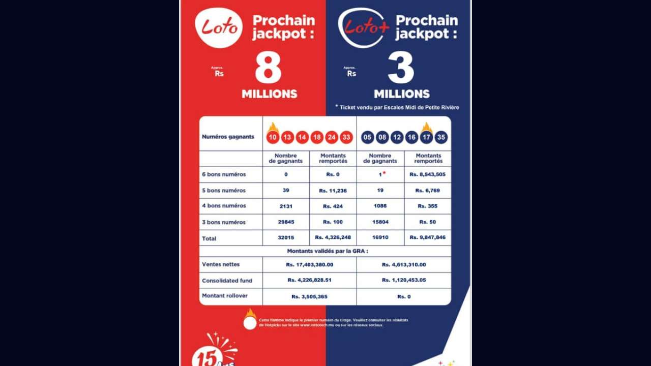 Un grand gagnant du Loto Plus repart ce soir avec la somme de Rs 8,5 millions. Le ticket gagnant a été vendu chez Escale Midi à Petite Rivière.