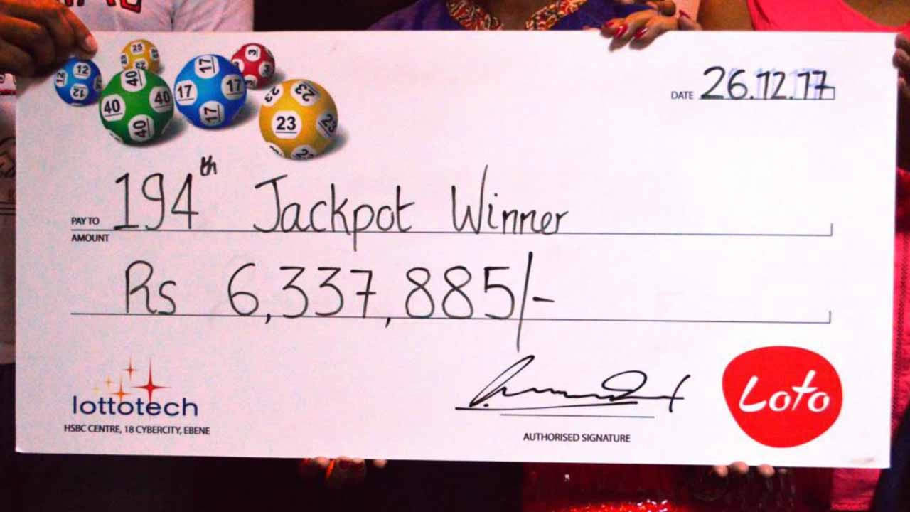 L’un des deux gagnants du jackpot du dernier tirage du Loto est une femme au foyer âgée d’une cinquantaine d’années. Mère de deux garçons, cette habitante des hautes Plaines-Wilhems s’est présentée au siège de Lottotech à Ébène ce mardi matin 26 décembre, accompagnée de sa famille, afin de toucher son chèque de Rs 6 337 885.