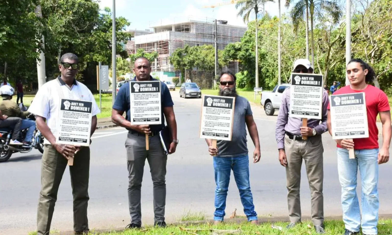 Manifestation de Bruneau Laurette et de quatre autres personnes devant l’ENL House à Moka, durant la journée de ce jeudi 8 septembre. Ce membre de One Moris milite pour les 300 licenciés de Building & Civil Engineering (BCE) et insiste pour que la décision du Redundancy Board, soit respectée. Soit celle sommant l’entreprise de payer trois mois par année de service aux licenciés.