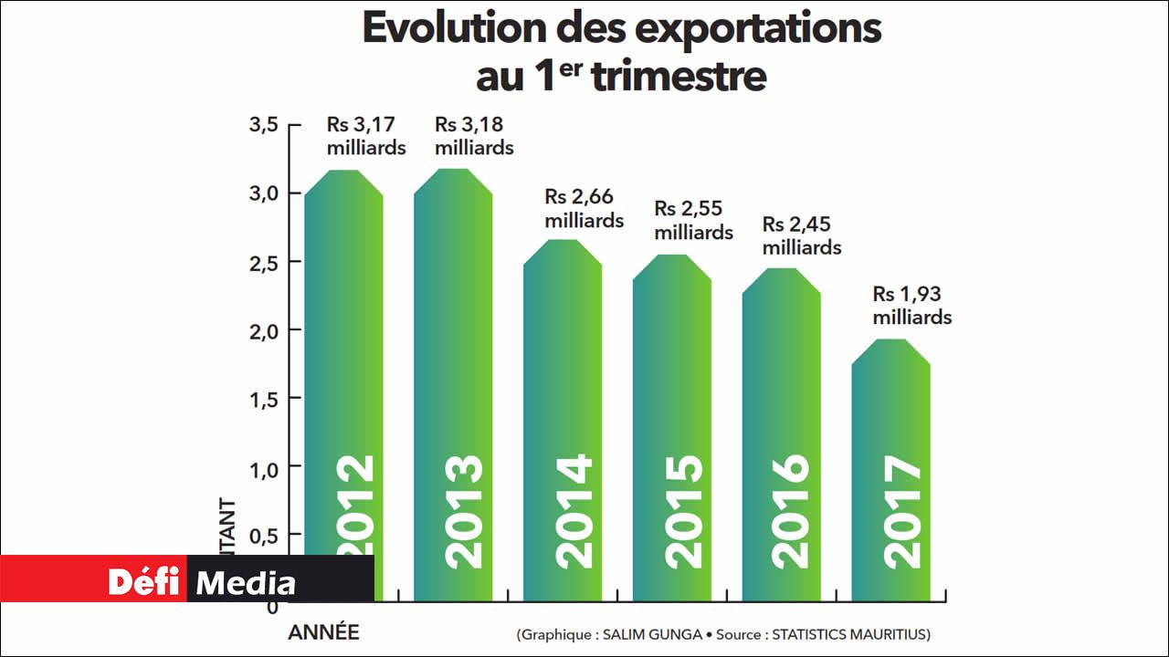 Comment est-ce que Maurice est concerné ? La Grande-Bretagne est un de nos principaux marchés. Au premier trimestre de 2017, ce pays a été le troisième marché pour nos exportations, avec un montant de Rs 1,93 milliard, en baisse de Rs 520 millions par rapport à la période similaire en 2016 (voir graphique). Dans l’industrie du tourisme, le pays a accueilli 28,913 touristes anglais, représentant une progression de 3,8 % selon le relevé trimestriel de Statistics Mauritius.