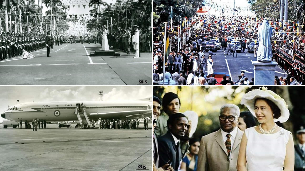 Le 23 mars 1972, le Britannia, yacht royal, accoste Port-Louis. La reine Elizabeth II et le prince Philip sont salués par le Premier ministre, sir Seewoosagur Ramgoolam, Gaëtan Duval, ministre des Affaires étrangères et lord-maire.