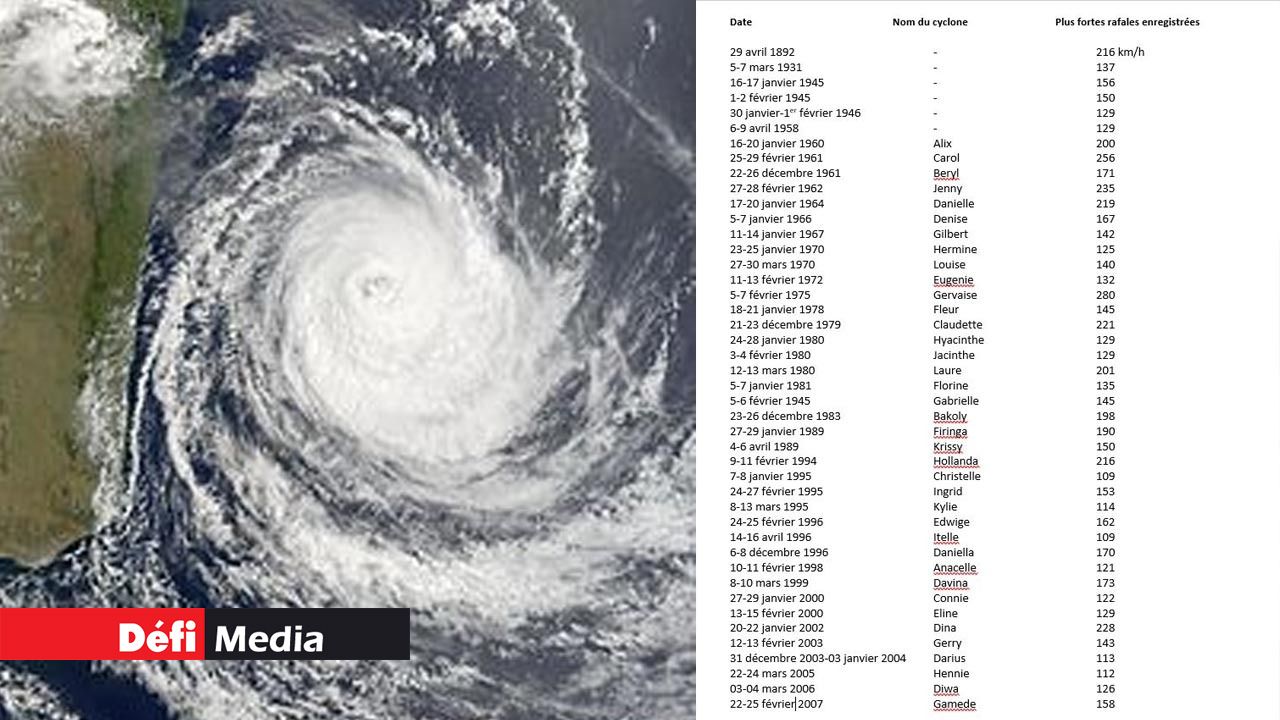 Depuis 1892, les services météorologiques de Vacoas ont classé 44 cyclones comme étant « historiques » de par leur force et/ou des dégâts provoqués. Le plus intense d’entre eux est Gervaise qui a traversé l’île du 5 au 7 février 1975.