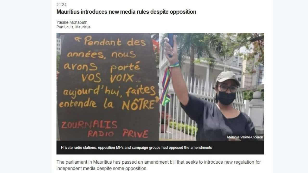 Le site Web de la BBC fait état ce mercredi soir des amendements à l’Independent Broadcasting Authority (IBA) Act. Dans un article ayant pour titre « Mauritius introduces new media rules despite opposition », la BBC rapporte que le Parlement mauricien a « adopté un projet de loi visant à introduire une nouvelle réglementation pour les médias indépendants malgré une certaine opposition ».