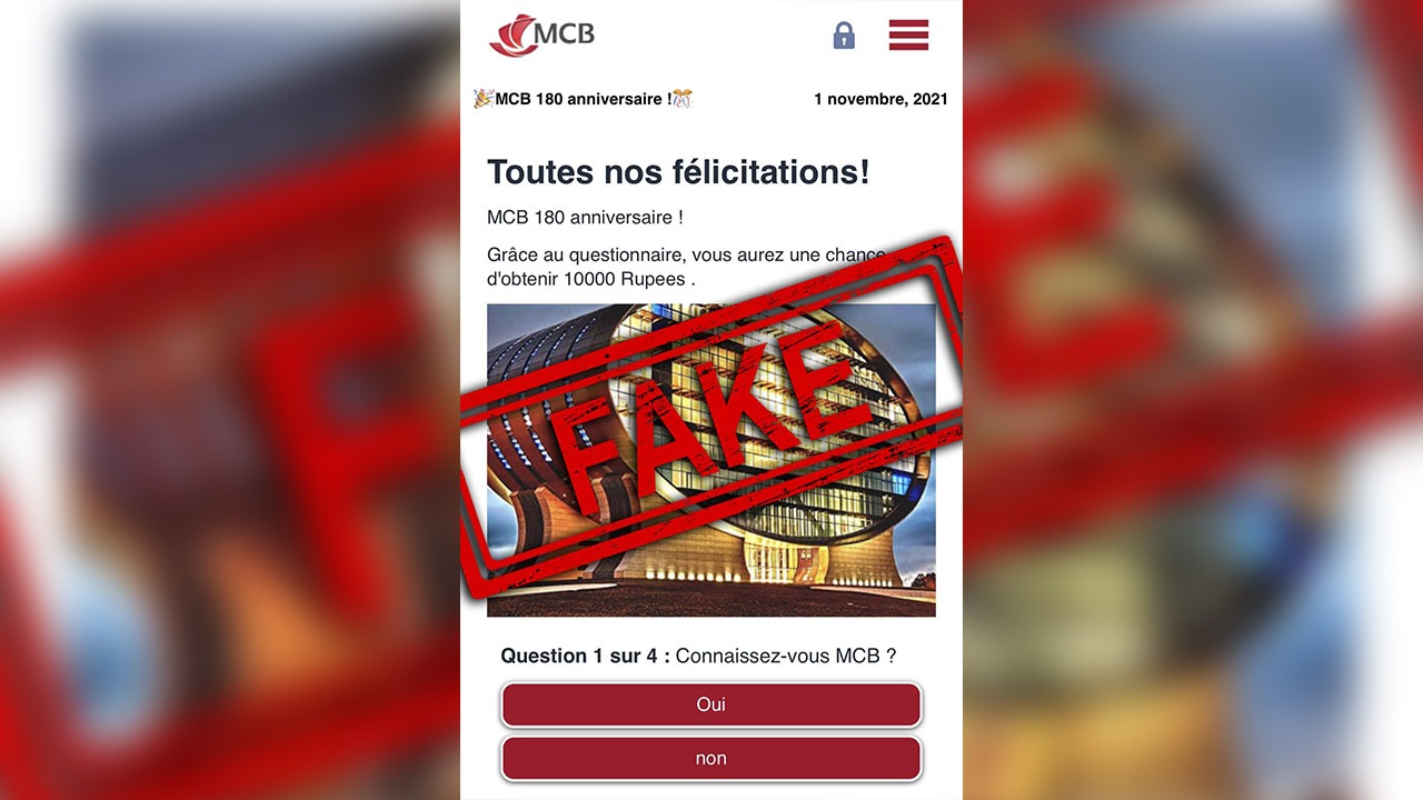 Attention, tentative d’arnaque ! Des personnes malintentionnées se font passer pour la Mauritius Commercial Bank (MCB) sous prétexte d’un sondage avec, à la clé, un prix Rs 10 000 à remporter. C’est ce qui ressort d’une publication sur la page Facebook de la banque commerciale, ce lundi 1er novembre 2021.