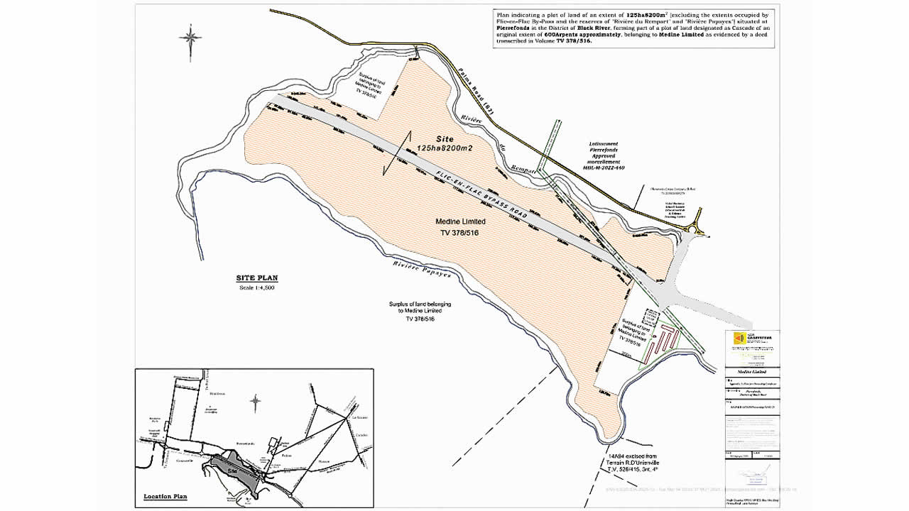 Ce développement, situé à Pierrefonds, concerne la subdivision de 125 hectares et 8 200 m² de terres (environ 300 arpents) appartenant à Medine Limited, en 1 901 lots : 1 789 parcelles résidentielles, 72 parcelles mixtes (résidentielles/commerciales), 39 espaces verts, un lot destiné à une maison de gardien et un syndic, ainsi qu’une parcelle réservée à une zone de forêt verte. Le site, actuellement exploité pour la culture de canne à sucre, est localisé le long du Flic-en-Flac Bypass, à proximité de localités telles que Palma, Bassin, Beaux-Songes, La Source, La Louise et Candos. Selon le rapport EIA, le terrain n’abrite ni flore ni faune d’intérêt écologique et n’est pas classé comme zone environnementale sensible. Les rivières du Rempart et Papayes, qui bordent le site, respectent les distances réglementaires imposées.
