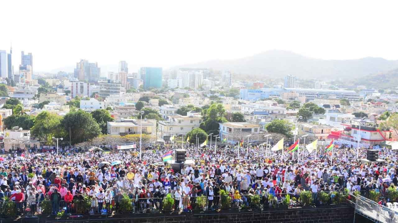 Au fil des minutes, la foule ne cesse de grossir à Marie Reine de la Paix, Port-Louis, où le pape François, célébrera une messe à 12 h 15 ce lundi 9 septembre.