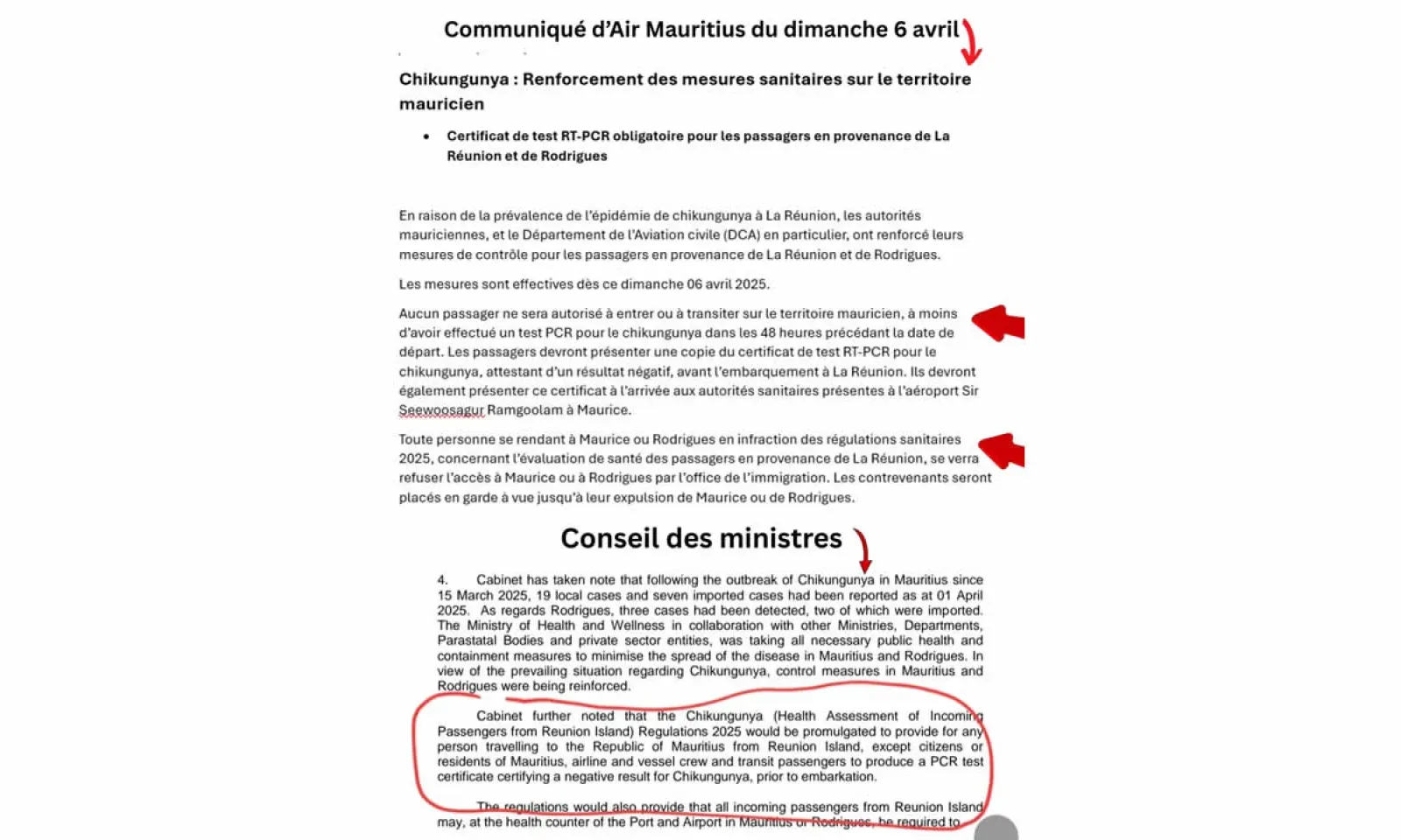 Enfin, un quatrième communiqué, mis en ligne le 7 avril à 14h57, précise que l’interdiction s’applique uniquement à « entrer sur le territoire mauricien », alors que les versions précédentes indiquaient aussi qu’aucun passager de La Réunion ne sera autorisé à entrer « ou à transiter sur le territoire mauricien », à moins d’avoir effectué un test PCR pour le chikungunya dans les 48 heures précédant la date de départ.