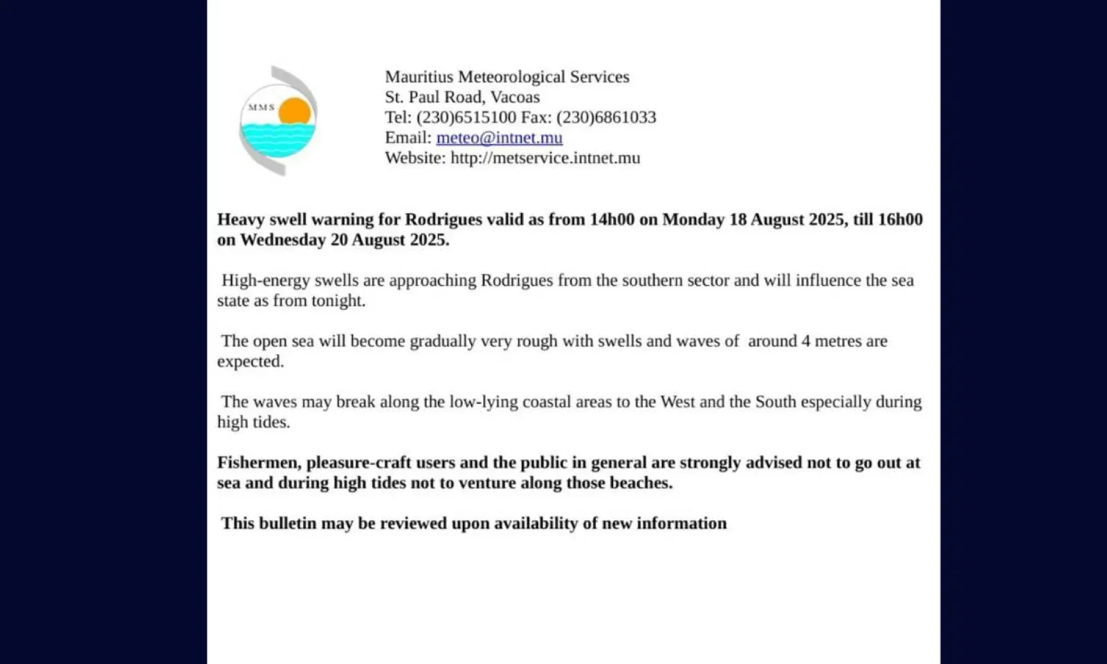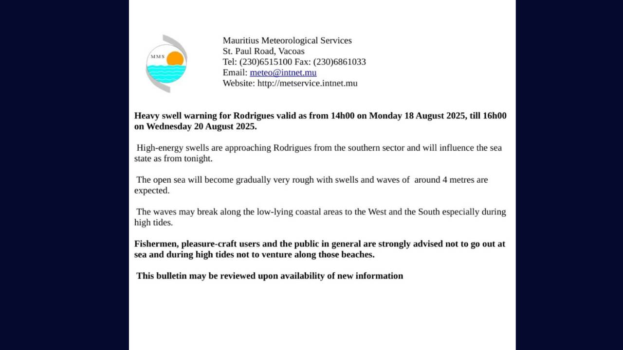 Un avertissement de fortes houles est en vigueur à Rodrigues depuis 14h00 ce lundi 18 août et ce, jusqu’à 16h00 mercredi 20 août 2025, selon le dernier bulletin émis par la station météorologique de Vacoas.